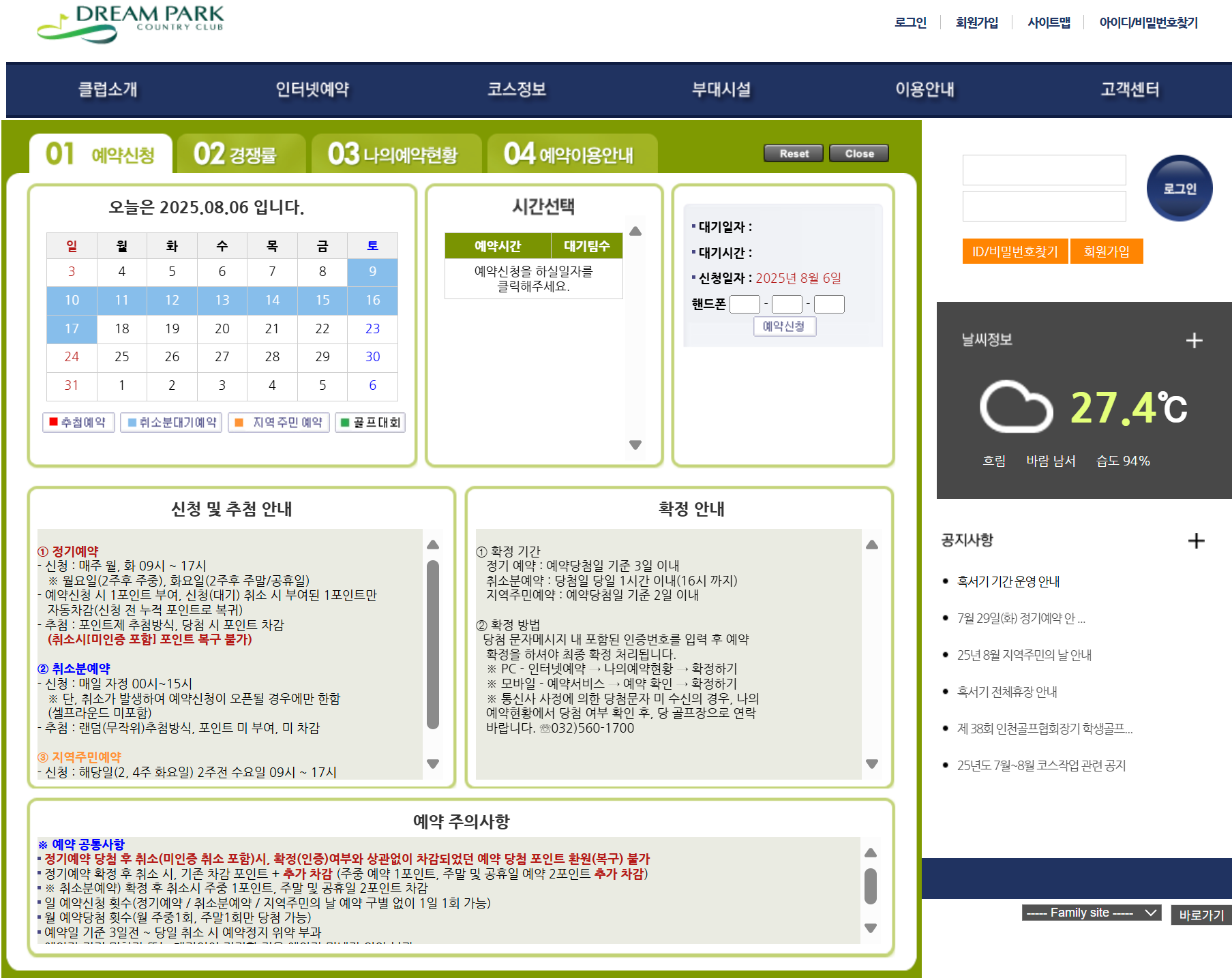 드림파크CC 예약은 전화 예약이 아닌 공식 홈페이지 추첨제로 진행됩니다.