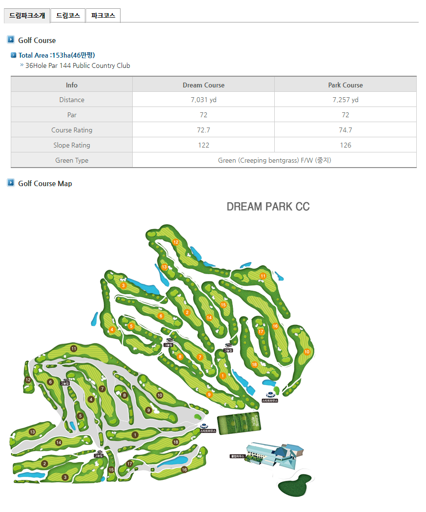 총 36홀(드림코스 18홀, 파크코스 18홀)로 구성되어 있으며, 전장이 길지 않고 평지형 코스라 체력 부담이 적은 것이 장점입니다.