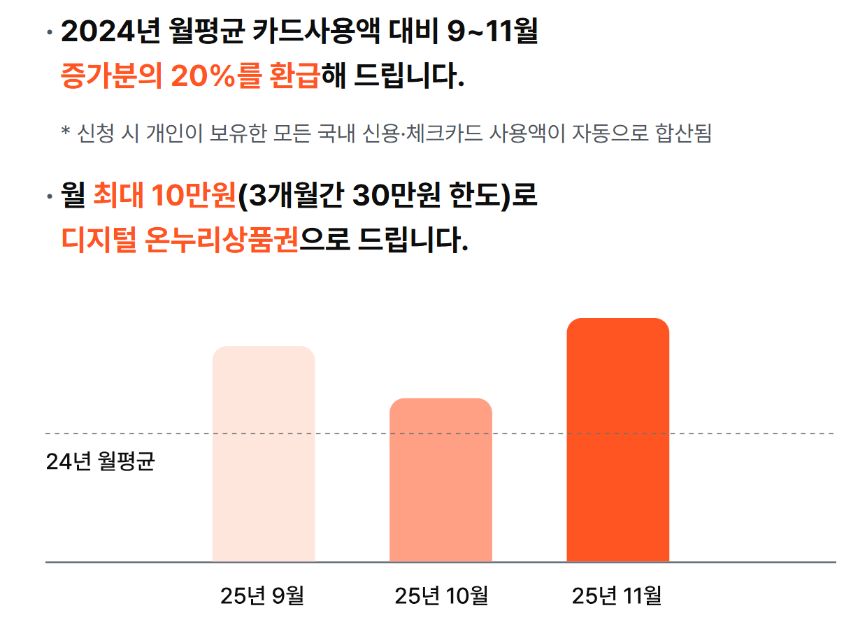 예를 들어, 작년 월평균 카드 소비액이 100만 원이고 올해 9월에 130만 원을 썼다면, 증가분 30만 원의 20%인 6만 원을 받을 수 있습니다.