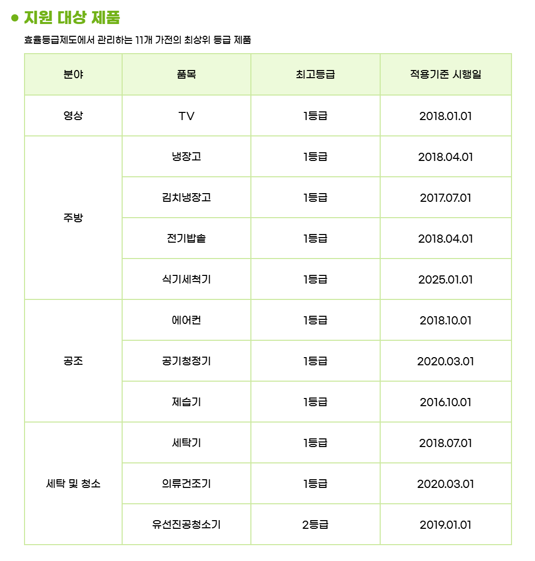 | 주방 | 냉장고, 김치냉장고, 전기밥솥, 식기세척기 | 에너지 1등급 |