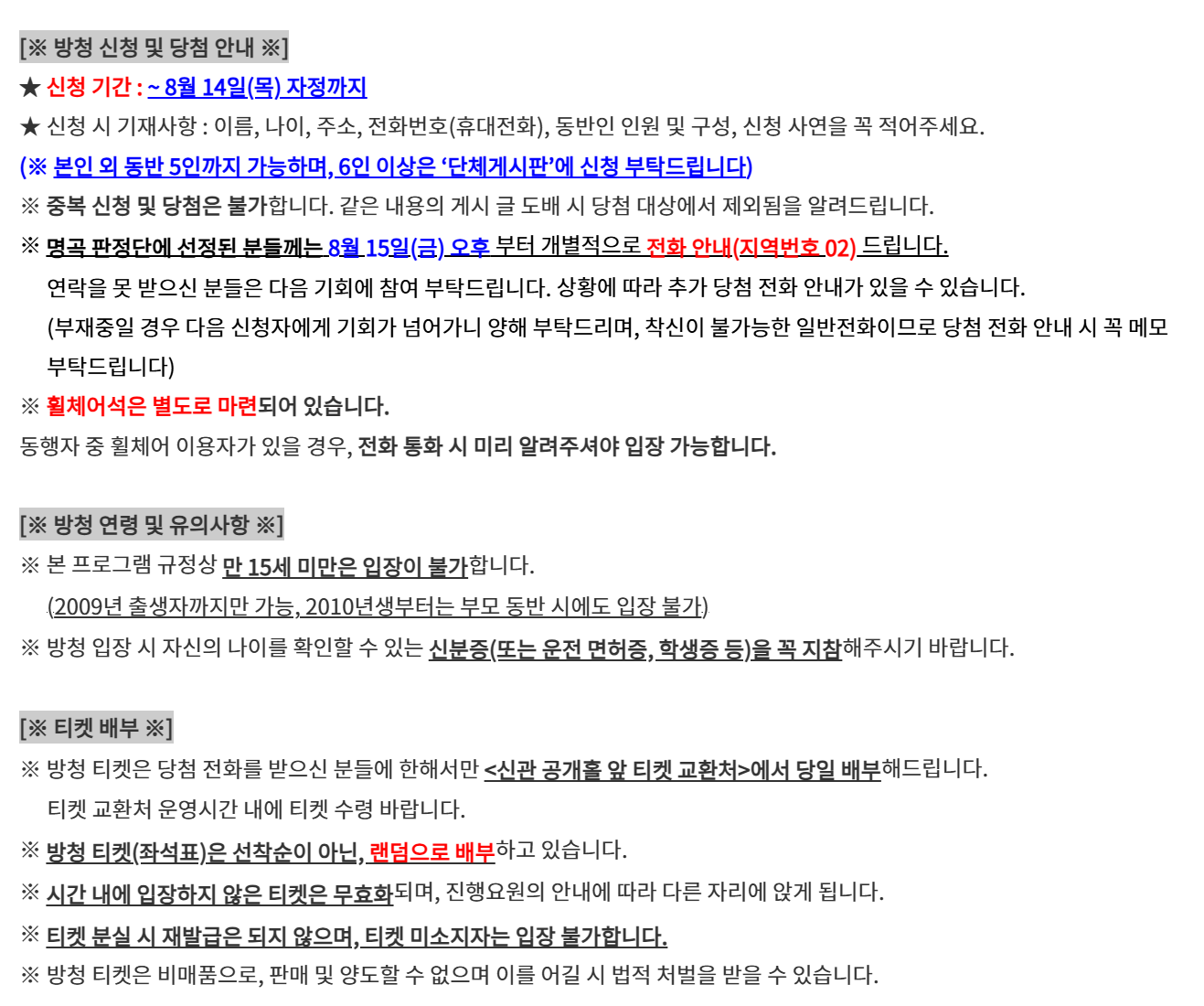 - 신청서 작성 (이름, 연락처, 동반 인원, 방청 사연)