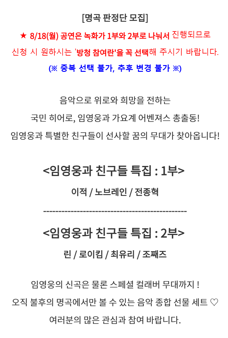 - 프로그램 형식 : 경연·순위 없이, 음악과 이야기로 채워진 힐링 콘서트