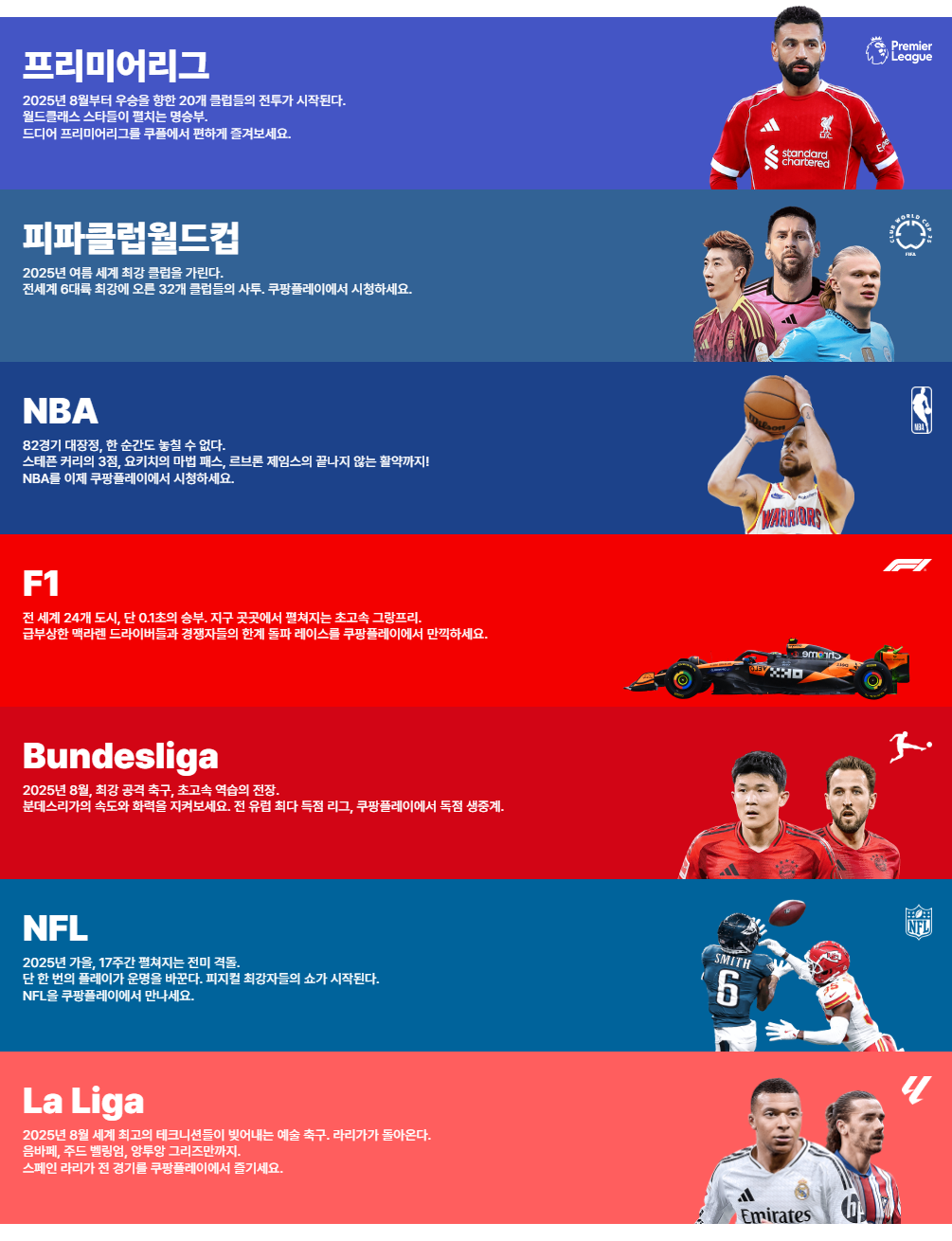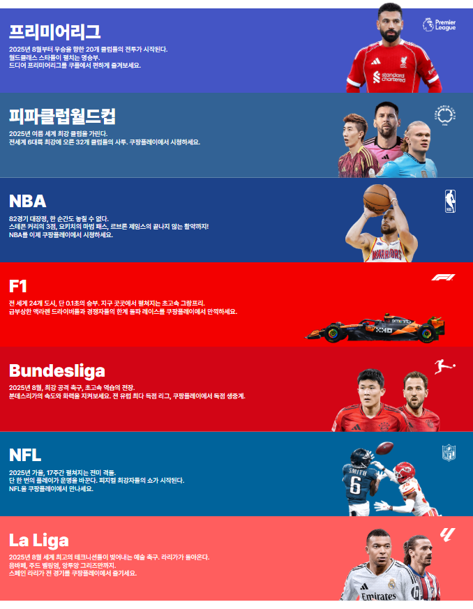 쿠플의 모든 스포츠를 스포츠 패스 하나로! 와우회원이라면 지금 할인 받고 시작하세요. FIFA 클럽 월드컵, 프리미어리그, 분데스리가, F1, NBA, NFL, LIV 골프 등 경기 생중계, 하이라이트, 풀경기 다