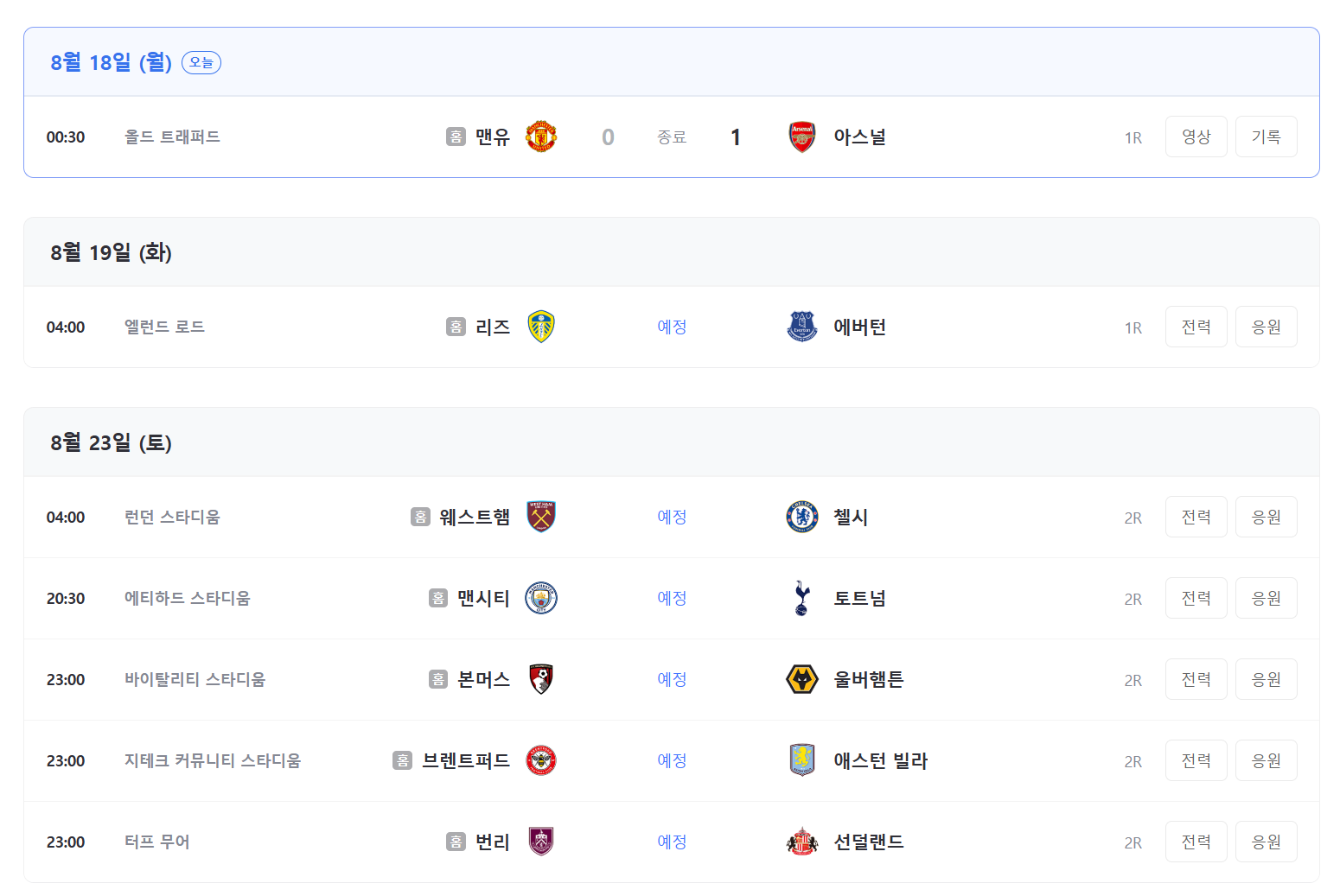 - 8월 23일(토) 04:00: 웨스트햄 vs 첼시