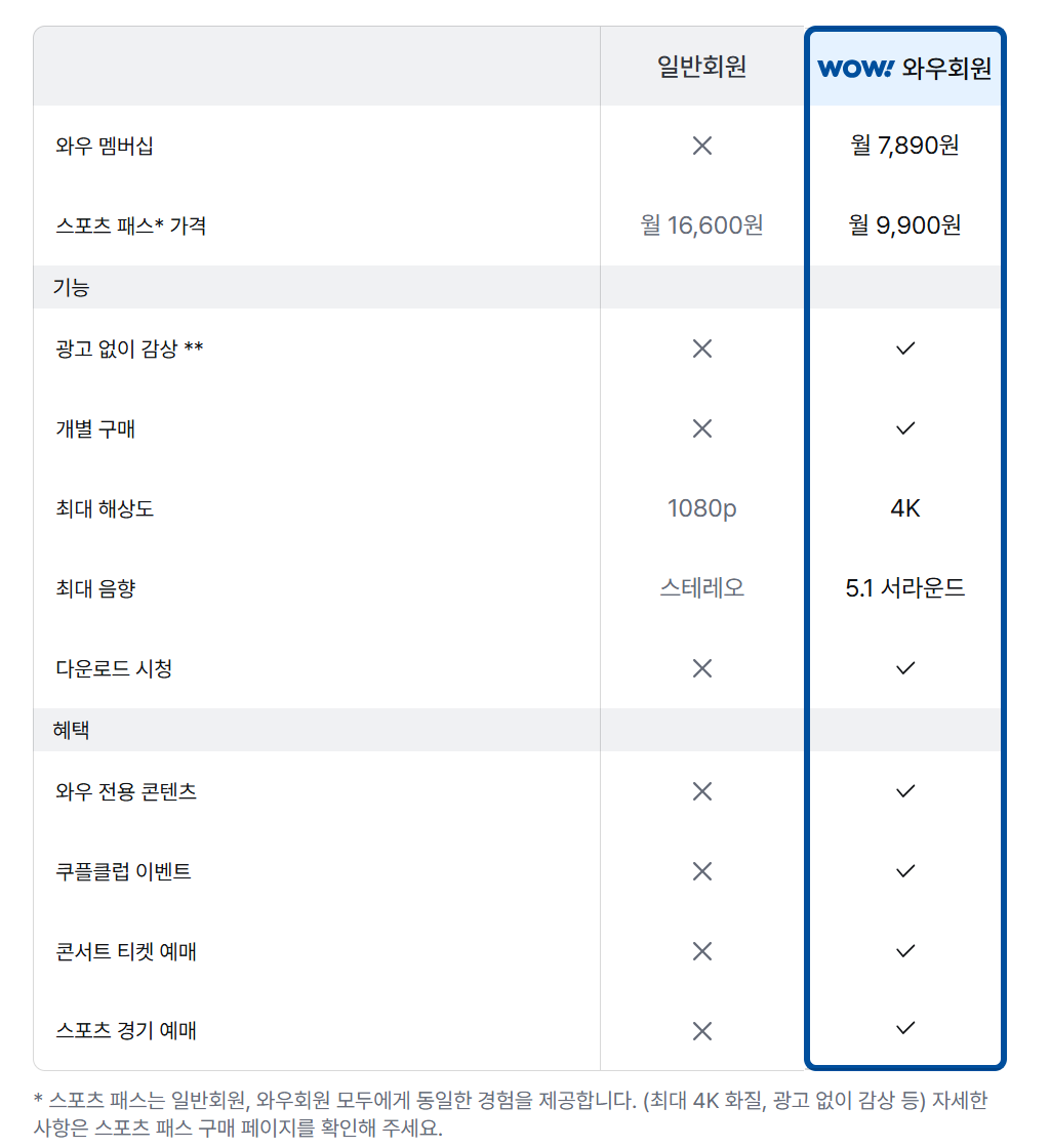 | 와우회원 | 와우 7,890원 + 스포츠패스 9,900원 | 월 17,790원 |