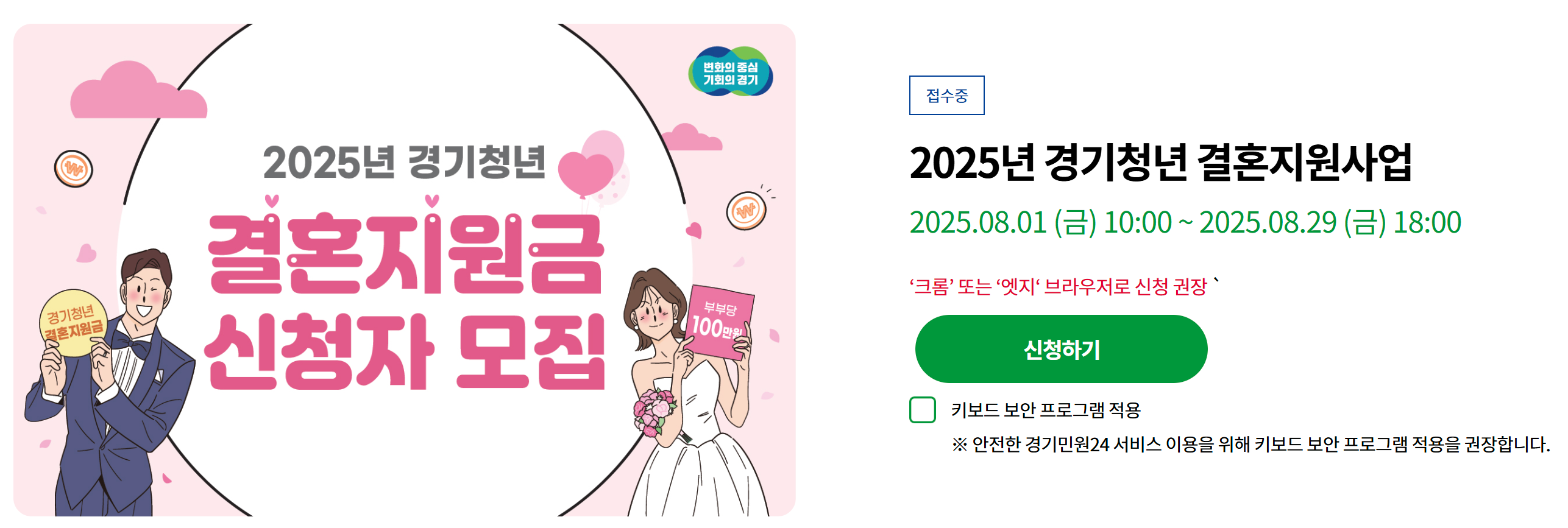 | 경기도 청년 결혼지원금 | 경기도 거주 만19~39세 청년부부 | 2025년 8/1~8/29 | 부부당 100만 원 | 11월 중 현금 |