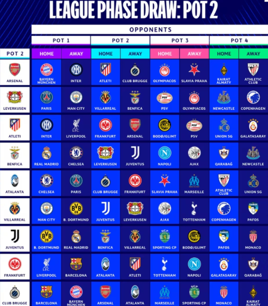 - PSG: 홈 vs 뮌헨, 토트넘, 뉴캐슬 / 원정 vs 바르셀로나, 레버쿠젠