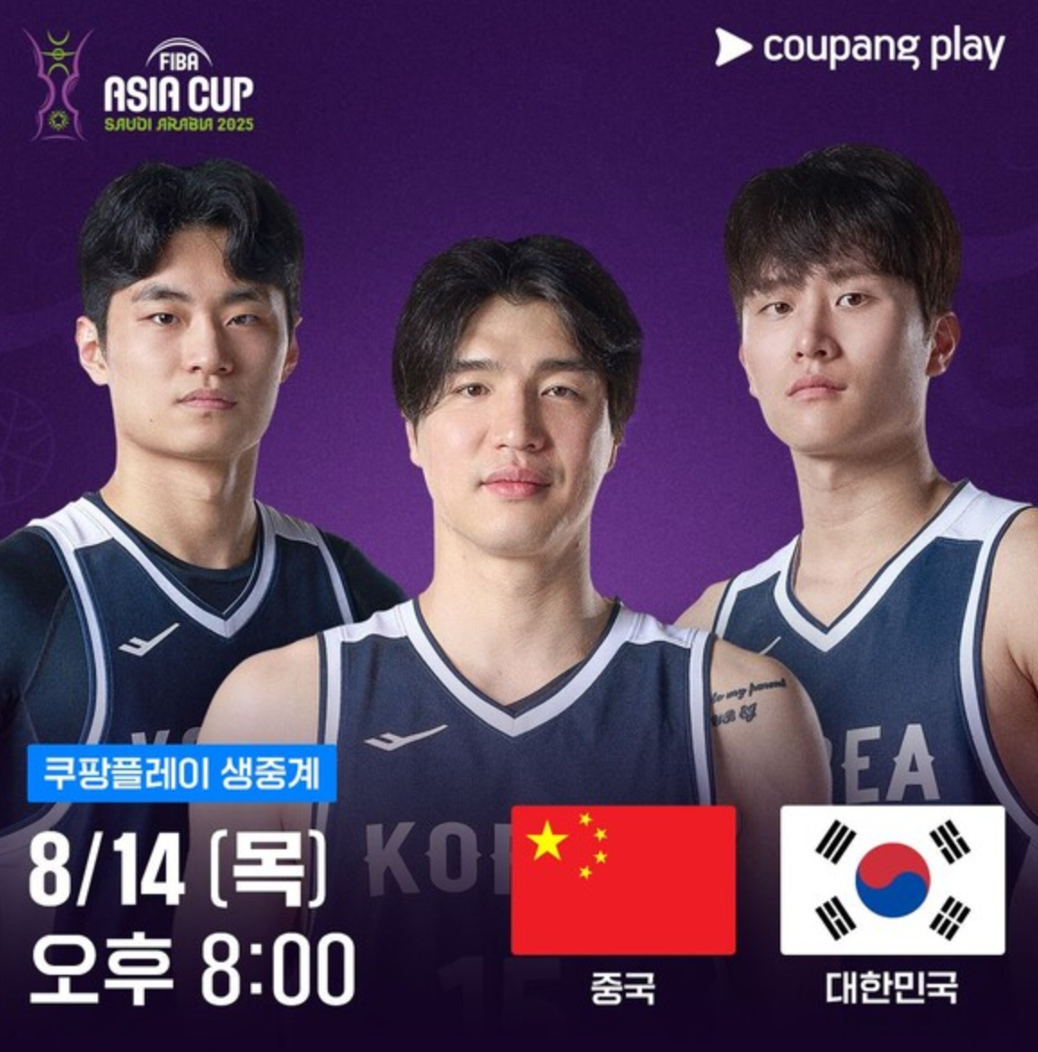 쿠팡플레이에서 실시간 생중계로 펼쳐질 2025 아시안컵 남자농구 8강전 한국 vs 중국!